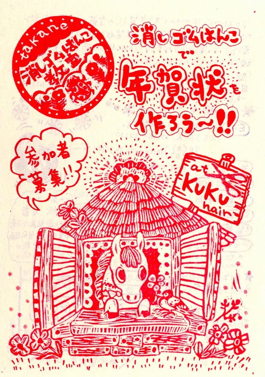 さて、毎年恒例の12月のハンコ教室「消しゴムはんこで年賀状を作ろう」の案内です。気付けば早いもので、もう年賀状の季節ですね。つい最近まで夏だと思っていたのに、もう師走が目の前まで来ていますね。お正月ですね!はやい!